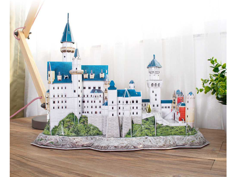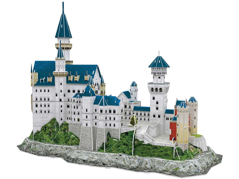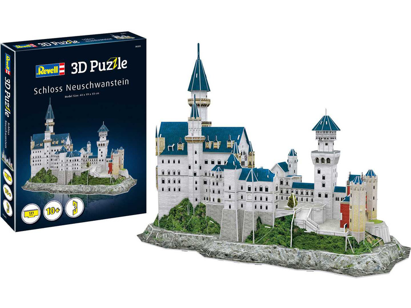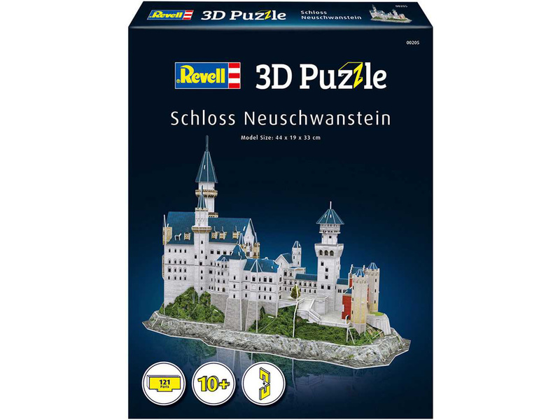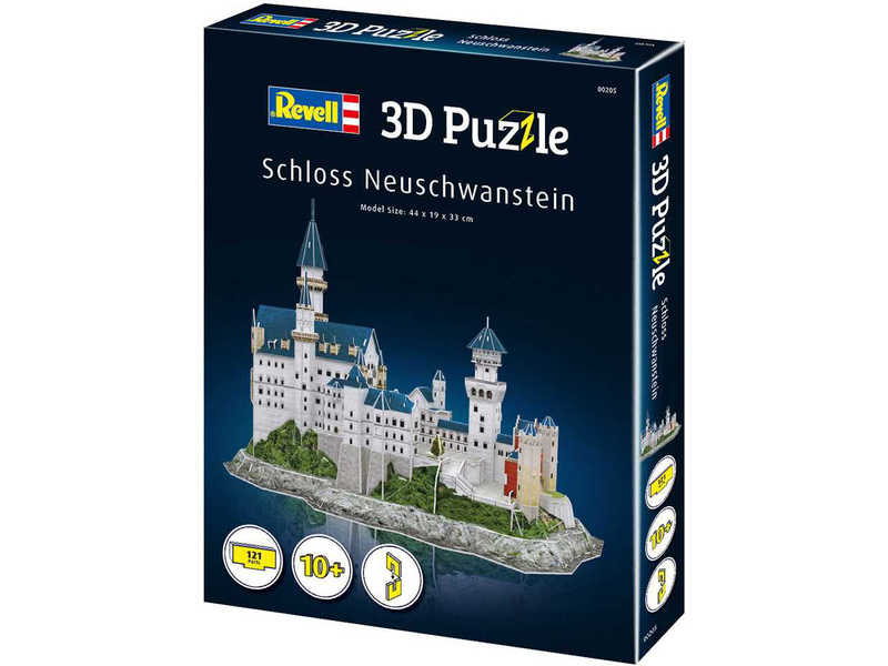 Prostorové 3D Puzzle Revell 00205 – zámek Neuschwanstein. Stavebnice má 121 dílků, výsledné rozměry modelu jsou 440 x 190 x 330 mm.