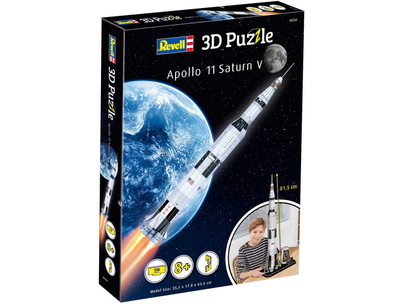 Prostorové 3D Puzzle Revell 00250 – Apollo 11 Saturn V. Stavebnice má 136 dílků, výsledné rozměry modelu jsou 355 x 170 x 815 mm.