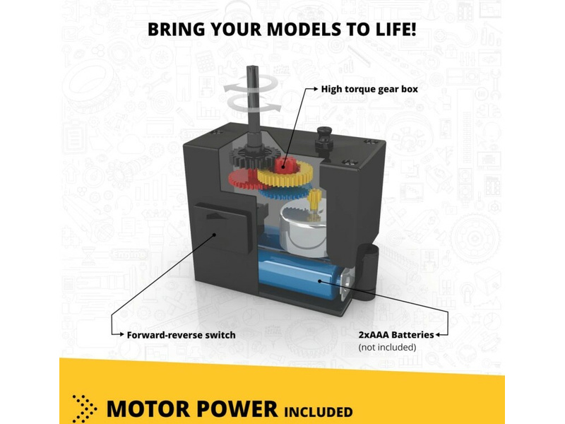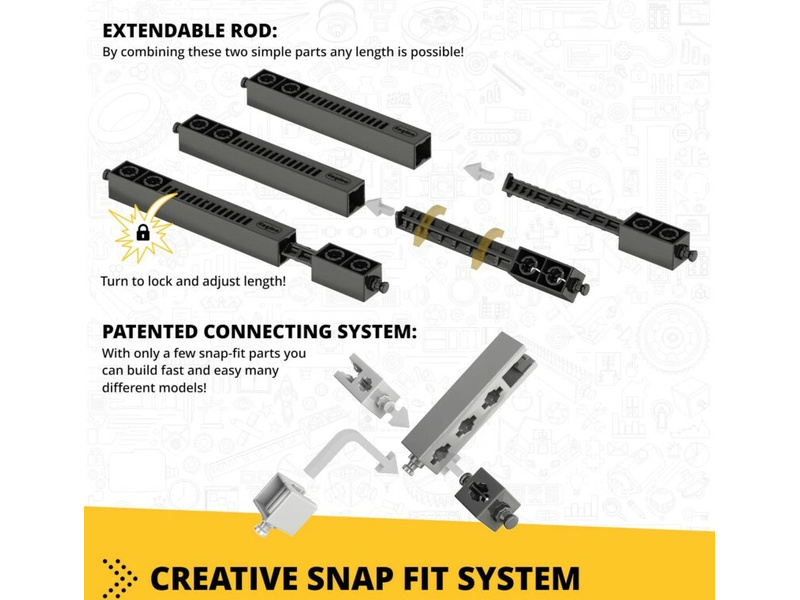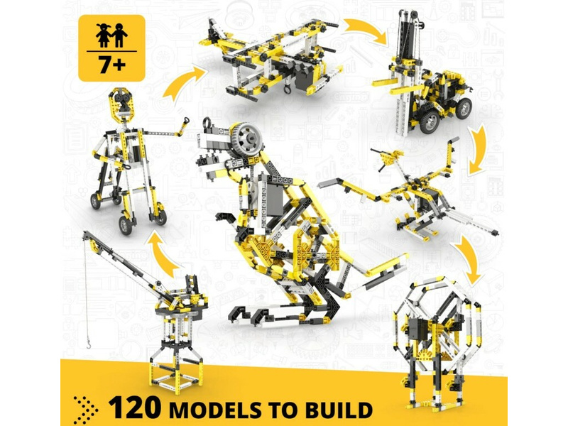 Engino Creative Builder 120 modelů + motor, je největší sadou Engino této řady. Obsahuje elektromotor pro rozpohybování modelů. Lez postavit 120 modelů všech témat pohybujících se věcí jako letadel, motocyklů, aut, stavebních strojů a dokonce i roztomilých zvířat. Tvé fantazii se nebudou klást žádné meze a můžeš vytvořit modely letadel a stíhaček, několik formulí a dragsterů, velká rýpadla nebo Jeepy a dokonce i kočárky či čtyřkolky. Zajímá tě svět zvířat? Sestav si draka nebo tarantuli. Zajímáš se o mechaniku a jak věci fungují? Pak zde najdeš houpačky, katapulty, kolotoče i ruské kolo. Doporučený věk 7+.