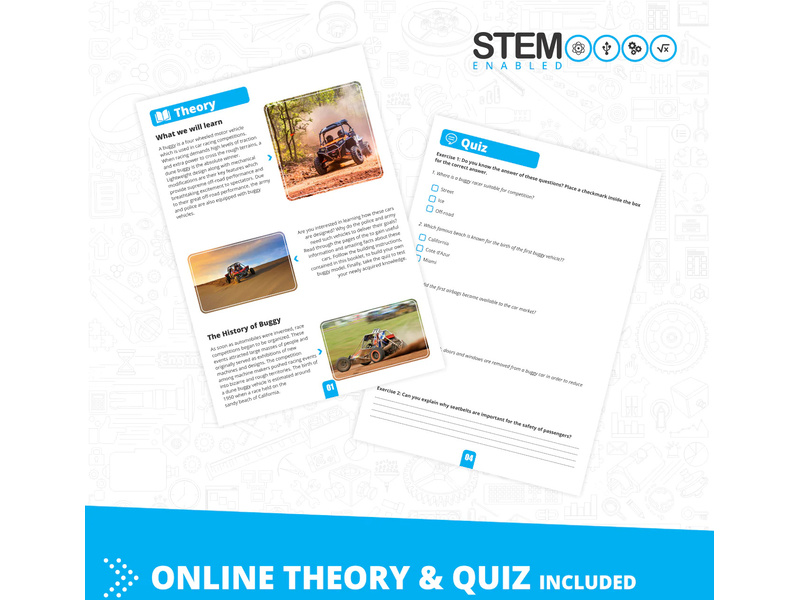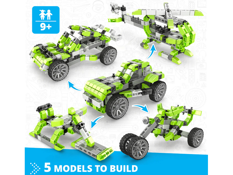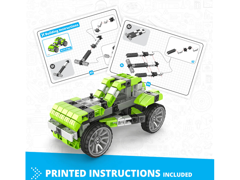 Stavebnice pro děti od 9 let, Engino Inventor Mechanics plážová bugina, sestavit lze 5 různých modelů, jako buggy, tříkolka, vrtulník nebo skibob. Jednoduchá kreativní stavebnice pro děti, s možností využít stávající díly k dalším stavebnicím Engino. Obrázkový přehledný barevný návod.