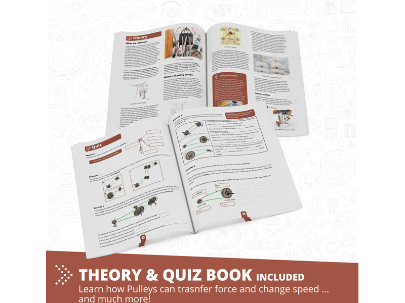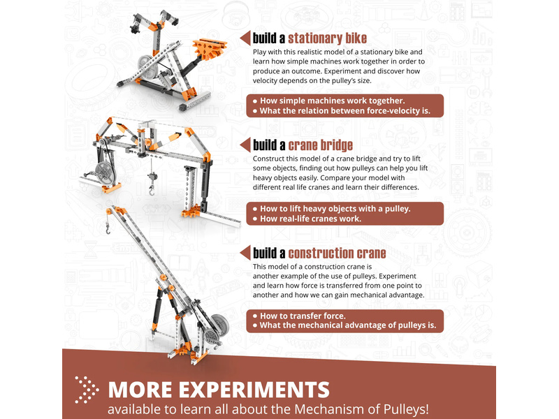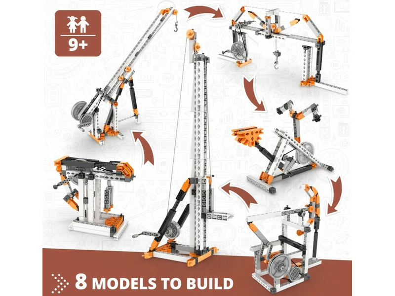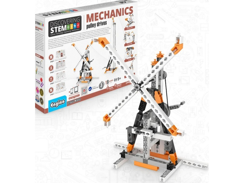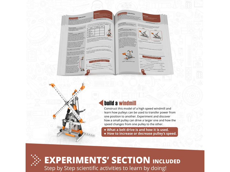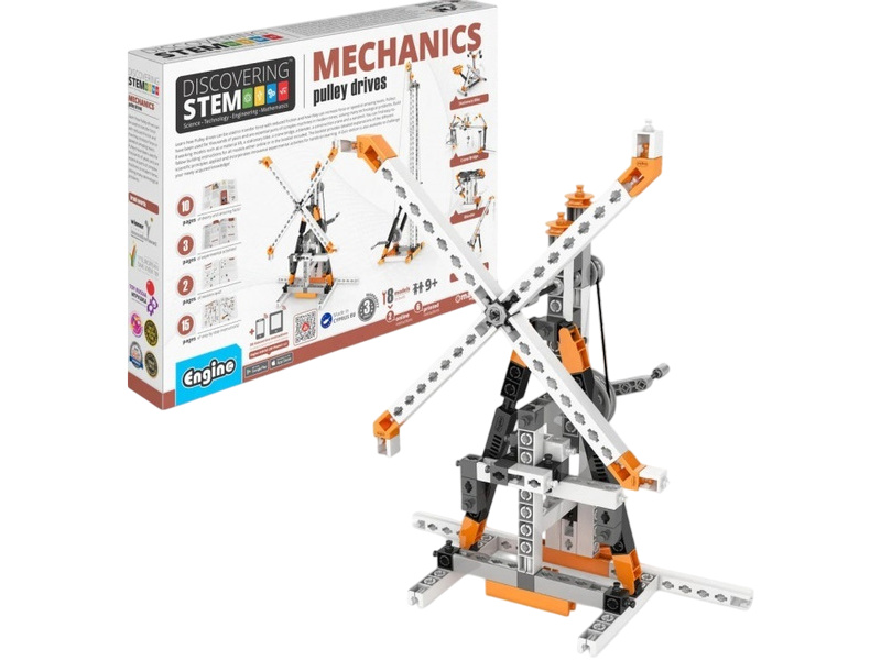 Zjistíte, jak lze řemenové pohony použít pro přenos síly se sníženým třením a jak mohou zvýšit sílu nebo rychlost. Kladky se používají již tisíce let a jsou nezbytnou součástí složitých strojů v moderní době, které řeší řadu technologických problémů. Postavte si 8 funkčních modelů, jako je tahání materiálu, stacionární kolo, jeřábový most, mixér, stavební jeřáb a větrný mlýn. Jednoduché pokyny pro sestavení všech modelů naleznete buď online, nebo v přiložené brožuře. Brožura poskytuje podrobné vysvětlení různých použitých vědeckých principů a zahrnuje inovativní experimentální aktivity pro praktické učení. K dispozici je také sekce Kvíz, ve které můžete otestovat své nově nabyté znalosti!