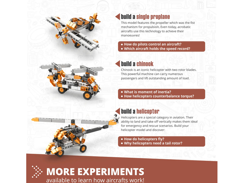 Děti se učí se STEM a během stavění modelů a experimentování se dozví odpovědí na otázky, jako kdo vynálezl letadelo, jak je piloti ovládají, jak létají vrtulníky, jaké síly ovlivňují let a další. Rozvoj letectva se považuje za jeden z vrcholů v historii lidstva, protože zcela změnil způsob, jakým cestujeme po Zemi.