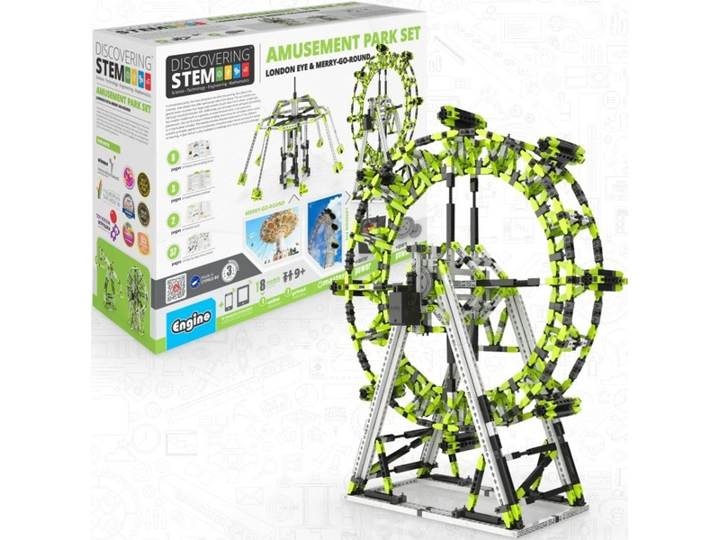Zábavné výukové stavebnice Engino Stem Zábavní park London Eye a kolotoč, postavte si dva velké modely, slavné vyhlídkové Oko (Eye) v Londýně a kolotoč! Tato sada obsahuje i motor s převodovkou pro pohon. Můžete experimentovat s ozubenými koly stavěním čtyř menších modelů. Vhodné pro věk 9+.