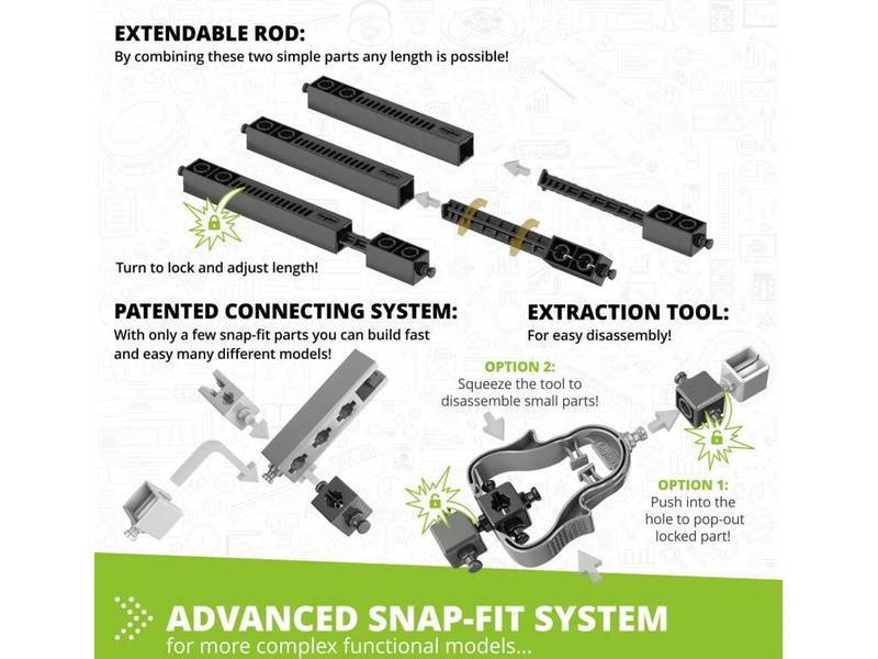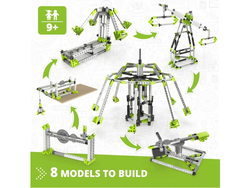 V zábavních parcích jsou hlavními atrakcemi vzrušující rychlé dráhy nebo romantická pomalá obří kola, která nabízejí nádherný výhled na okolí z výšky. Tato sada obsahuje jeden motor s převodovkou pro pohon čtyř velkých modelů takových jízd: ruské kolo, London Eye, kolotoč a posilovač. Kromě toho můžete experimentovat s ozubenými koly stavěním čtyř menších modelů, jako je převodovka, experimentální jeřáb, kolotoč a planetárium. Jednoduché návody na sestavení všech modelů naleznete buď online, nebo v přiložené brožuře. Brožura poskytuje podrobná vysvětlení různých použitých vědeckých principů a zahrnuje inovativní experimentální aktivity pro praktické učení. K dispozici je také sekce Kvíz, ve které můžete otestovat své nově nabyté znalosti!