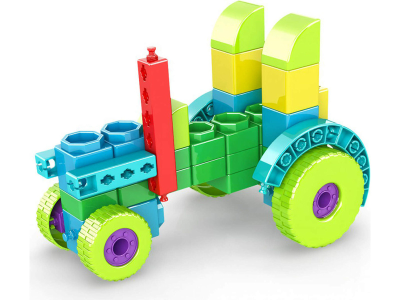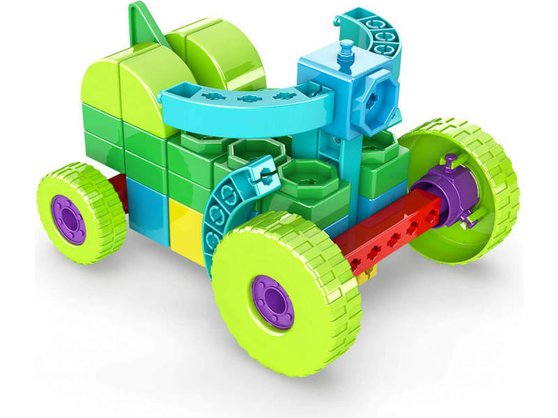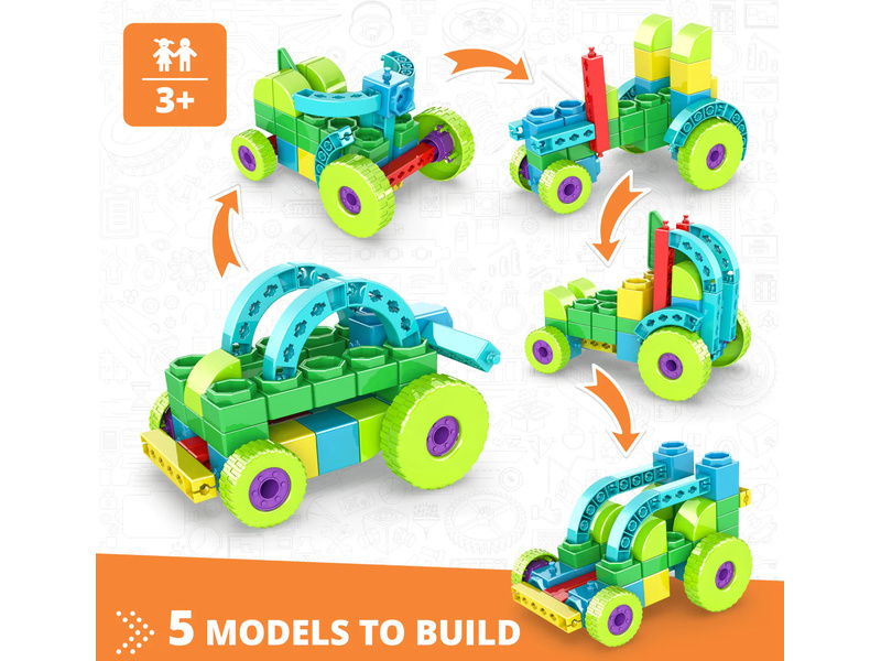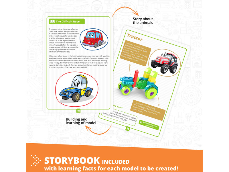 Připravte se na první velkou závodní výzvu s Maxem, nejrychlejším autem v okolí, se stavebnicí STEM LABS junior - Engino Učíme se o vozidlech. Postavte si návěs, traktor, čtyřkolku, sportovní auto a SUV. Projděte si barevnou brožurku s neobvyklými fakty o vašich oblíbených vozidlech.