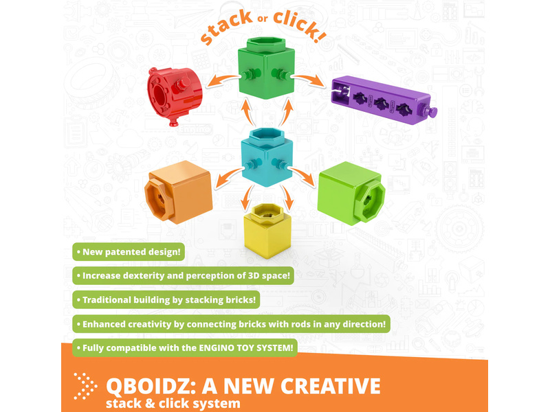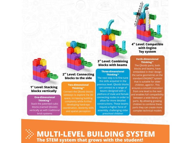 Kostyk Engino se dělí do 4 subsystému podle věku. Baby Qboidz zaměřené na bezpečnost a rozvoj motorických schopností od 1.5 roku. Qboidz od 3 let přidává některé speciální spojovací prvky a zaměřuje se na kognitivní rozvoj. Engino Classic což jsou originální původní kostky pro děti od 6 let, umožňující komplexní stavbu ve více osách. Engino Mechanics od 9 let s technickými díly jako jsou převody a ozubená kola.