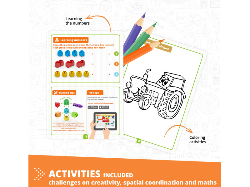Když dokončí stavění, děti si mohou vzít si do ruky pastelky a ozdobit si svá vozidla. Děti navíc získají: plnobarevnou brožurku s neobvyklými fakty o jejich oblíbených vozidlech, tvůrčí umělecké aktivity, jako jsou spojování teček, vybarvování a bludiště, zábavná cvičení pro párování a počítání, super jednoduché návody na stavění pro malé ručičky a tvůrčí mysl.