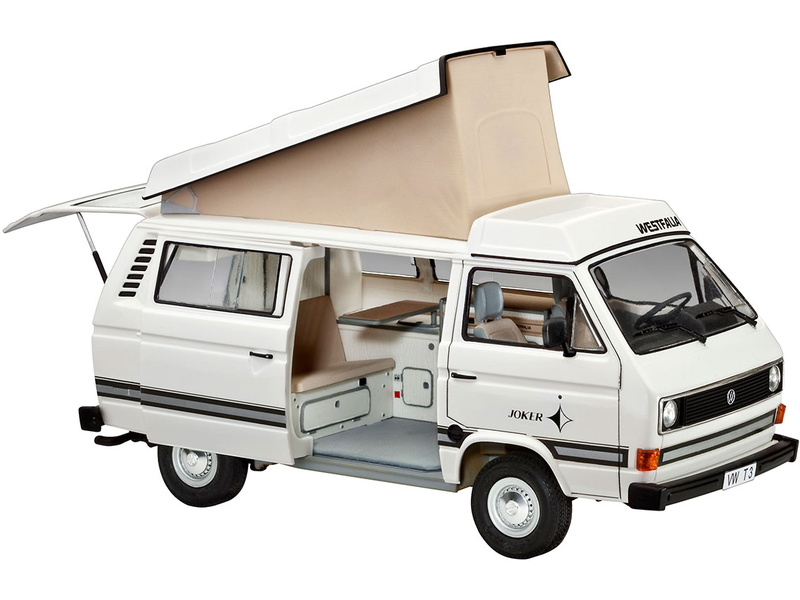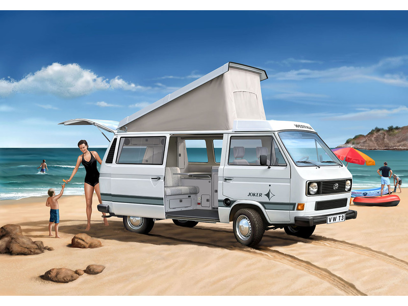 Plastikový model Revell 07344 – auto VW T3 Camper v měřítku 1:25 ke slepení. Stavebnice obsahuje 80 dílků, délka 185 mm, obtížnost 3.