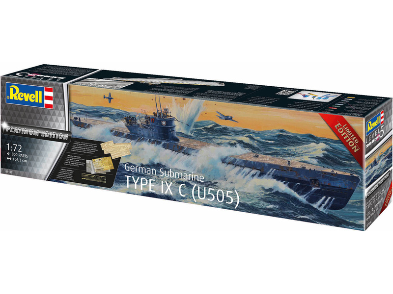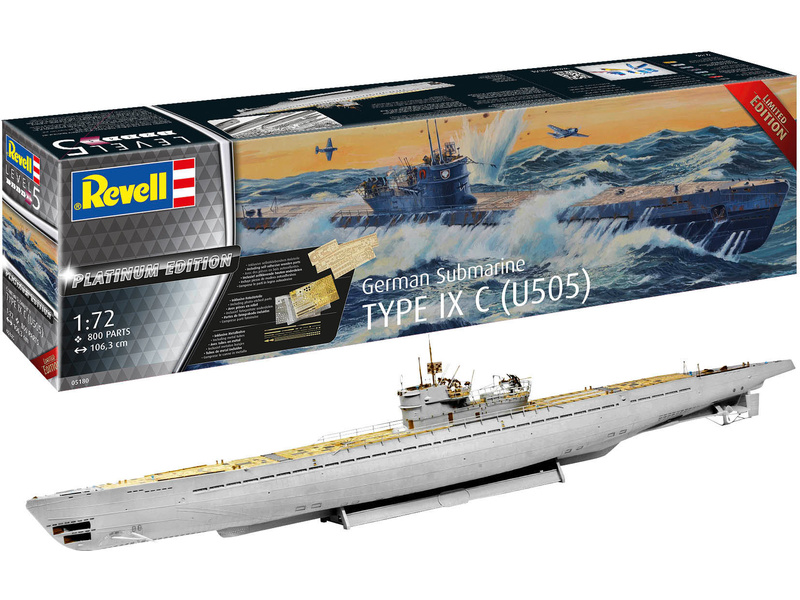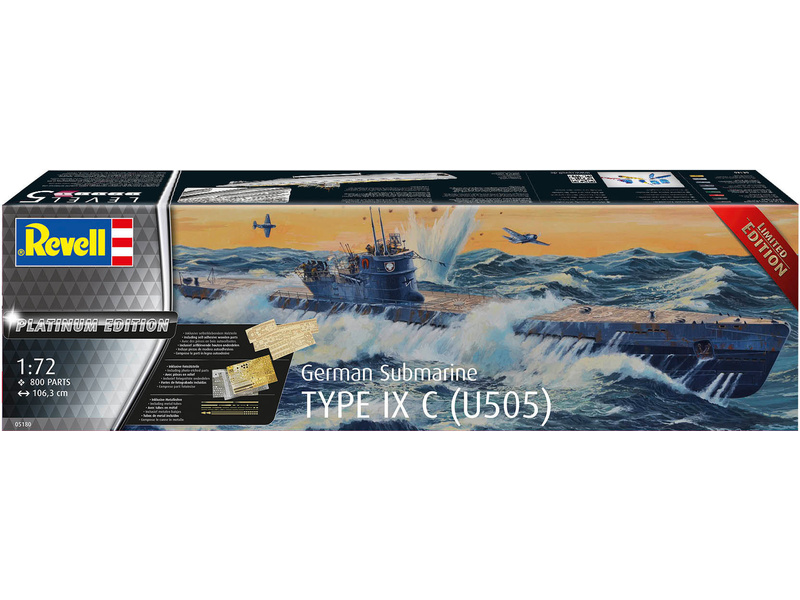 Plastikový model Revell 05180 - ponorka Type IX C Platinum Edition v měřítku 1:72 ke slepení. Stavebnice obsahuje 800 dílků, délka 1063 mm, obtížnost 5.