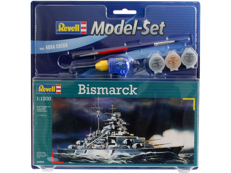 Plastikový model Revell 65802 - loď Bismarck v měřítku 1:1200 ke slepení. Stavebnice obsahuje 31 dílků, lepidlo, štětec a barvičky, délka 200 mm, obtížnost 3.