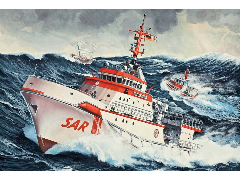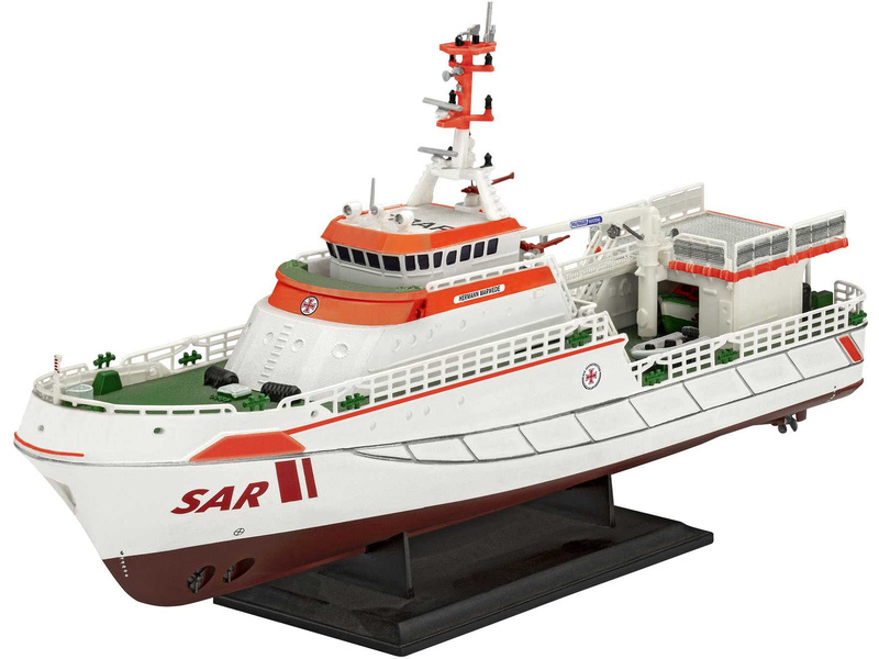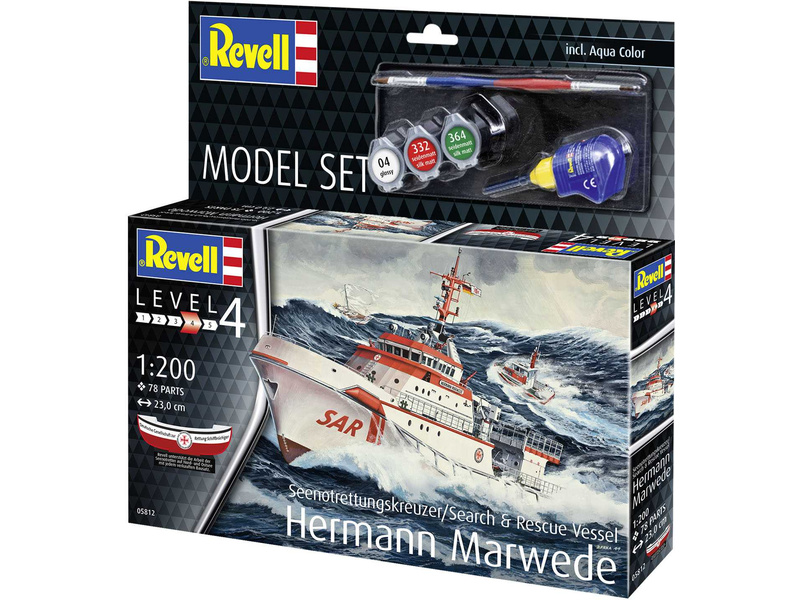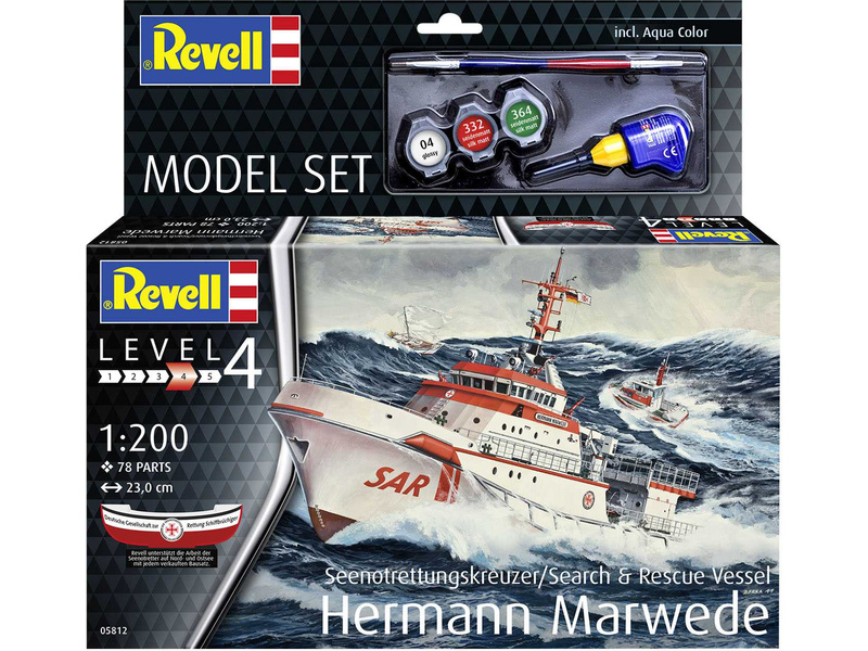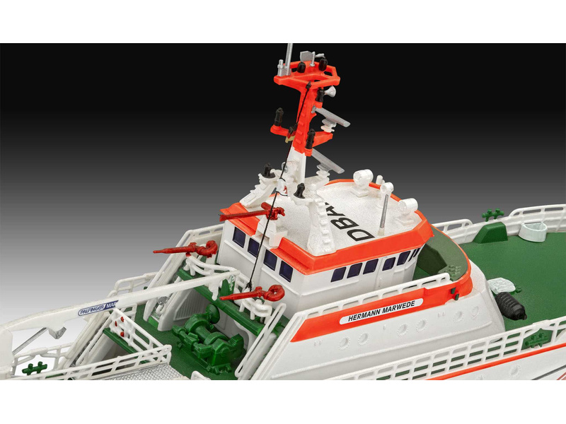 Plastikový model lodě Revell 65812 - DGzRS Hermann Marwede ke slepení. Délka: 23,0 cm, balení obsahuje 78 dílků ke slepení, lepidlo, štětec a 3 barvičky (5 ml).