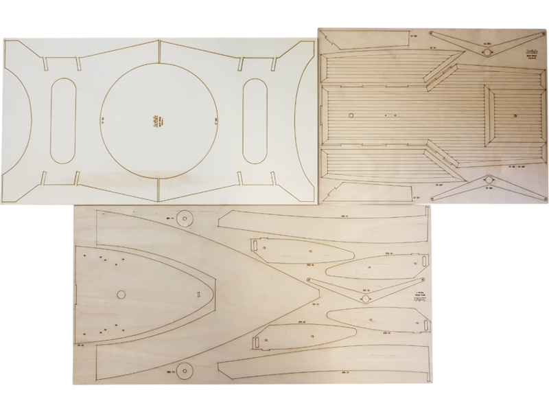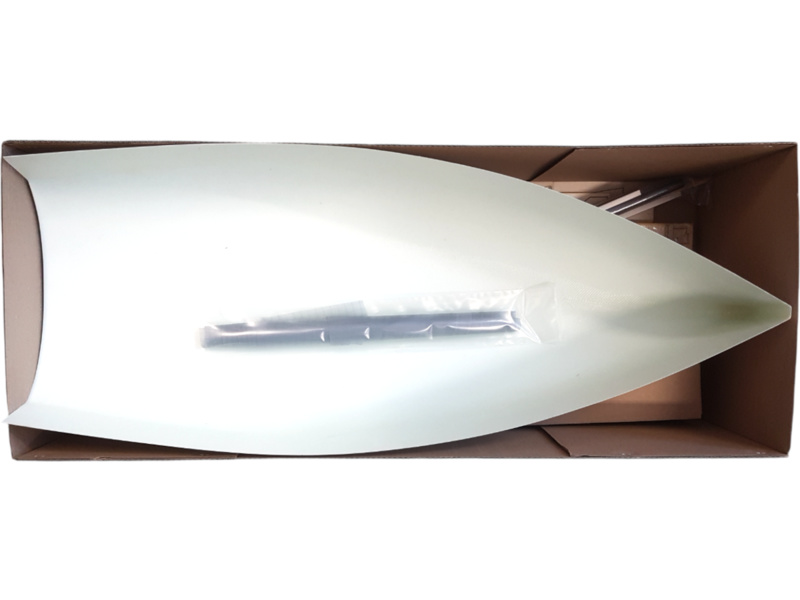 Po otevření víka krabice naleznete laminátový trup, dřevěné díly modelu z překližky ve strečové fólii, drobné součásti uzavřené v sáčcích, plachty, maketové součásti a obrazkový manuál.