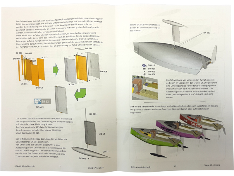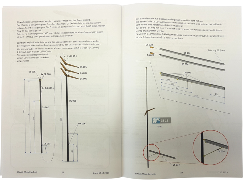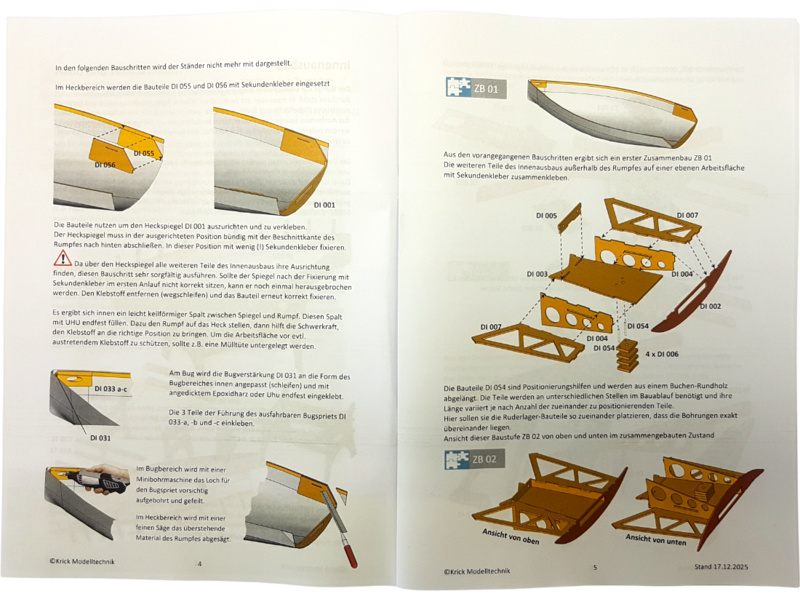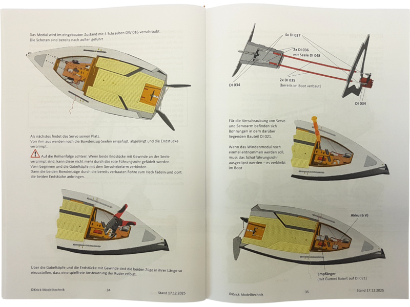 Set obsahuje kompletní obrazový návod s obrázky jednotlivých kroků stavby. V návodu je kromě stavby a sestavení takeláže obsažen i postup zástavby elektronikou.