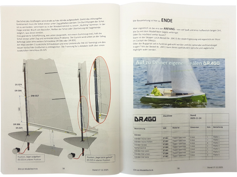 Stavebnice RC modelu lodi Krick Drago v měřítku 1:6. Moderní, sportovní, věrně zpracovaná plachetnice s laminátovým trupem a uhlíkovým stěžněm. Elektronika se prodává samostatně. Délka 1000mm. Podrobný stavební návod umožňuje snadnou montáž i pokročilejším začátečníkům. Denní model plachetnice vyvinutý Uwe Kreckelem s výsuvným čelenem a dvojitým kormidlem byl navržen tak, aby nabízel sportovní i vyvážené plavební vlastnosti. Díky promyšlené konstrukci a detailnímu zpracování vznikla moderní stavebnice s mnoha možnostmi a realistickým vzhledem. Pohyblivá postavička kapitána Luca (prodává se samostatně) je pomyslnou třešničkou na dortu – dodává modelu živost a autentičnost a rozšiřuje zážitek z modelového jachtingu o další rozměr.