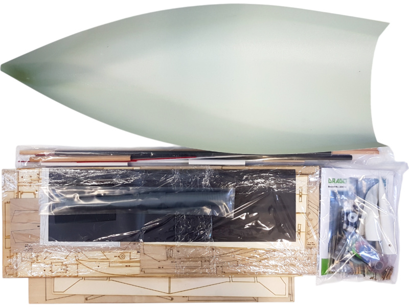 Balení obsahuje hotový trup, laserem vyřezané překližkové díly, karbonový stěžeň, předřezané plachty, ráhna, díly kování, různobarevná lana, samolepicí dekoraci s motivem draka a podrobný stavební návod.