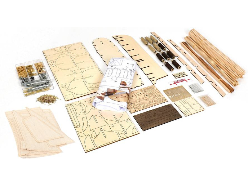 V balení jsou díly pro stavbu - laserem řezané díly, lišty, mosazné fotolepy, lanoví a další.