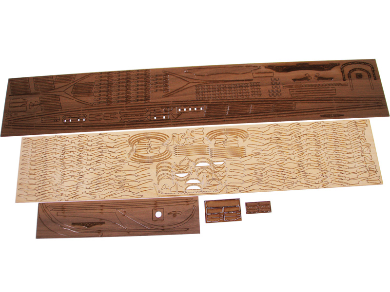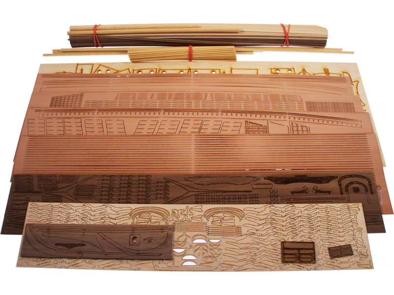 Po otevření víka krabice naleznete dřevěné díly modelu z překližky, sadu lišt, drobné součásti uzavřené v plastovém průhledném blistru, sadu výkresů a manuál.
