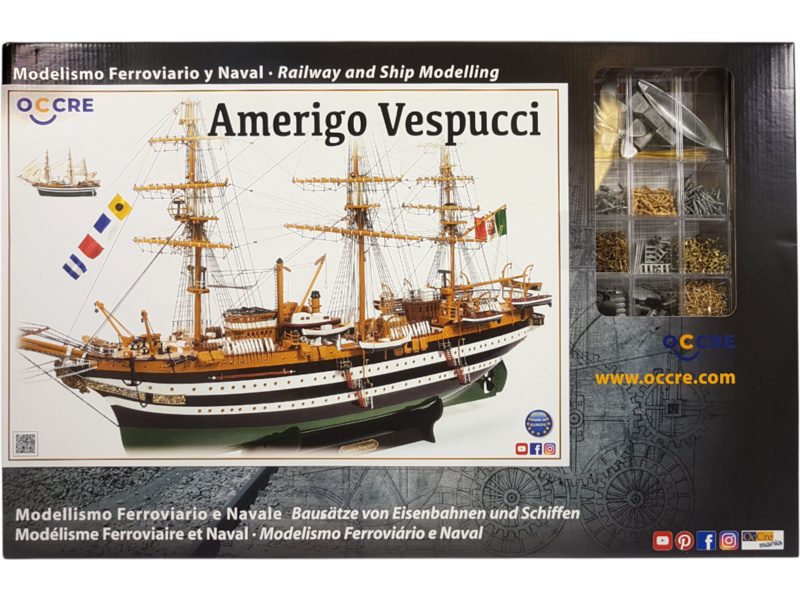 Stavebnice neplovoucího modelu lodi Amerigo Vespucci od značky OCCRE v měřítku 1:100. Propracovaný model jedné z nejkrásnějších plachetnic. Stavba převážně ze dřeva, laserem řezané díly, kovové odlitky, mosazné fotolepy, lanoví. Výhodou je špičkové balení, obrázkový návod, sada výkresů a videotutoriály.