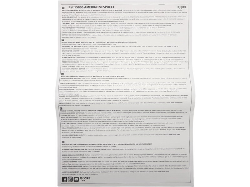 Stavebnice neplovoucího modelu lodi Amerigo Vespucci od značky OCCRE v měřítku 1:100. Propracovaný model jedné z nejkrásnějších plachetnic. Stavba převážně ze dřeva, plošné díly jsou přesně řezané laserem. Plaňkování je dvojité. Pro vystavení lodi poslouží stojánek s kovovou odlévanou plaketou s názvem lodi. Na modelu je velké množství detailů, včetně několika menších člunů. Pro vyvázání lanoví jsou v balení různé provázky. Plachty nejsou obsahem balení. Tento model je možné také pořídit ve variantě s plachtami - KR-oc15006, nebo jsou plachty k dispozici samostatně KR-oc15006V. Výhodou stavebnice je špičkové balení s dobře ochráněnými díly, obrázkový návod krok po kroku, sada výkresů a videotutoriály.