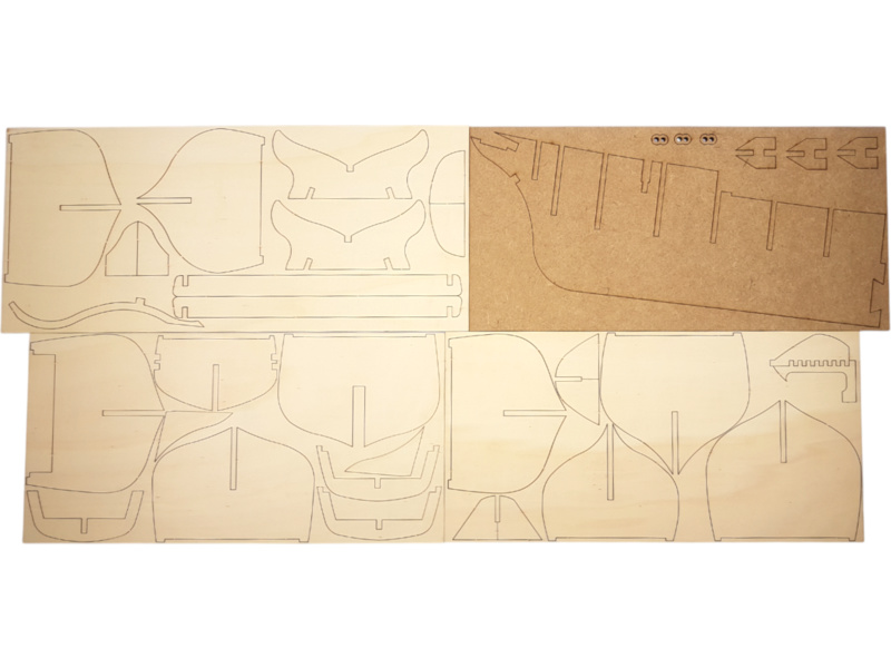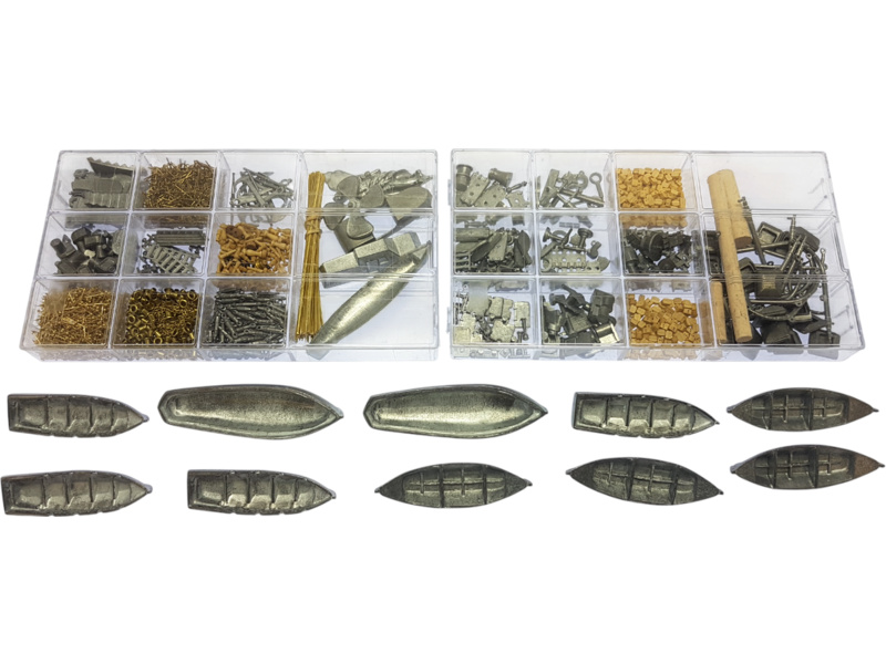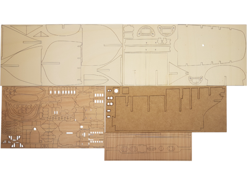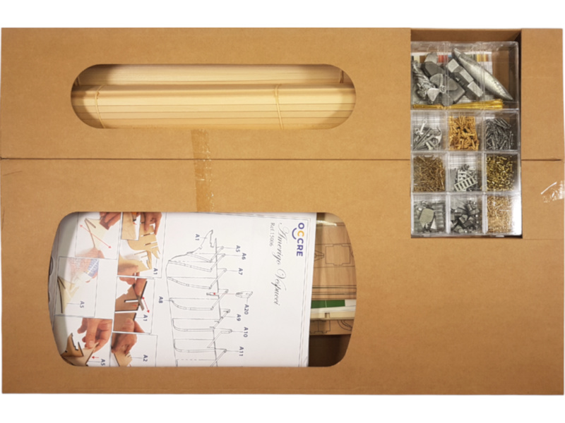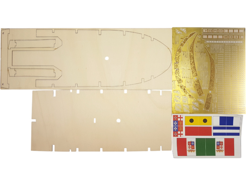 Balení obsahuje laserem řezané dřevěné díly, plaňky, palubu, stožáry, dřevěné díly, kovové odlitky, mosazné díly, mosazné fotolepy, lanoví, vlajky, stojánek. Návod a stavební plány.