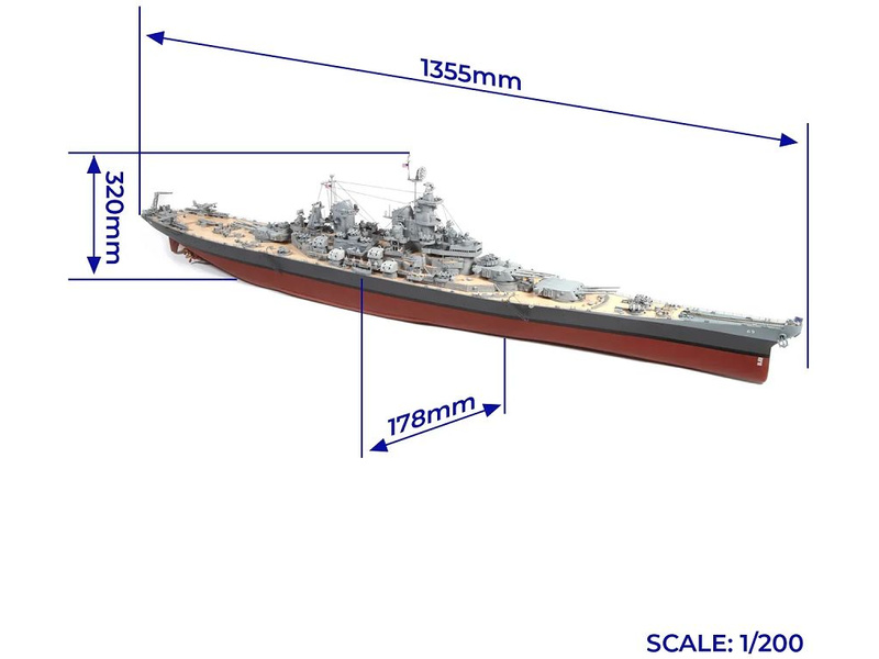 Stavebnice neplovoucího modelu lodi OCCRE USS Missouri, v měřítku 1:200. V balení jsou díly pro stavbu - laserem řezané díly, lišty, mosazné fotolepy, lanoví a další. Stavební výkresy a návod.