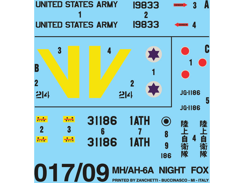 Plastikový model Italeri 0017 - vrtulník Boeing AH-6 Night Fox v měřítku 1:72 ke slepení. Délka modelu 136 mm, obtížnost 2. Balení obsahuje SKVĚLÉ OBTISKY PRO 3 VERZE.