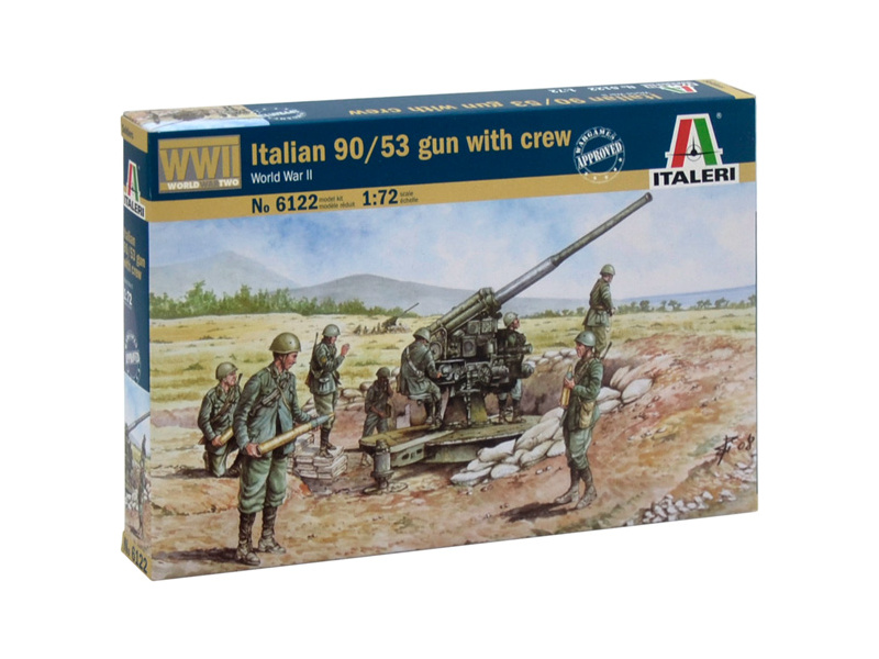 Plastikový model Italeri 6122 - figurky ITALIAN 90/53 GUN with CREW v měřítku 1:72. Obtížnost 1. Ideální pro doplnění plastikových modelů či diorámat.