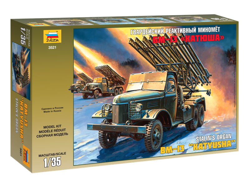 Plastikový model Zvezda 3521 - raketomet BM-13 "Kaťuša" v měřítku 1:35 ke slepení. Stavebnice obsahuje 332 dílků, délka 210 mm.