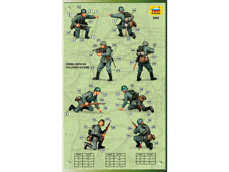 Sada figurek Zvezda 3582 – němečtí Panzergrenadiers doplňujících plastikové modely. Velikost figurek je 1:35; 5 cm. Balení obsahuje 53 dílků. Ideální pro doplnění plastikových modelů či diorámat.