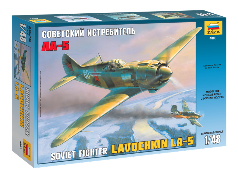 Plastikový model Zvezda 4803 - letadlo Lavochkin La-5 v měřítku 1:48 ke slepení. Stavebnice obsahuje 151 dílků, délka 180 mm, obtížnost 3.