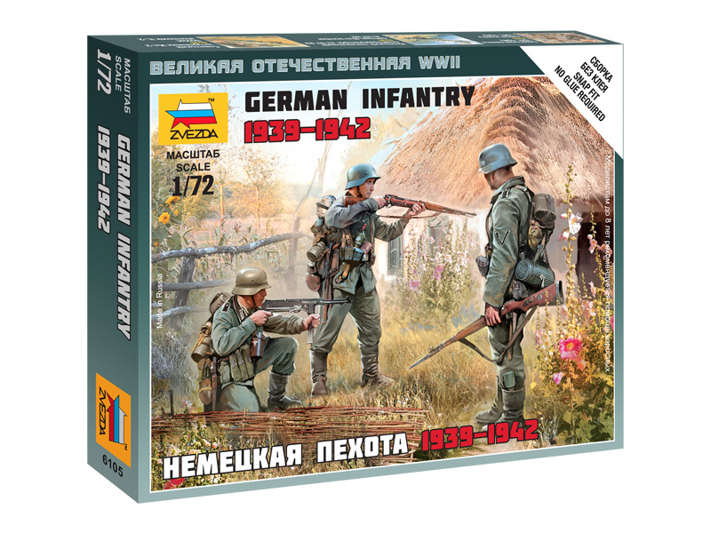 Plastikový model Zvezda 6105 – figurky německé pěchoty z východní fronty 1939-1942 v měřítku 1:72. Stavebnice obsahuje 28 dílků, výška figurky 24 mm, obtížnost 2. Ideální pro doplnění plastikových modelů či diorámat.