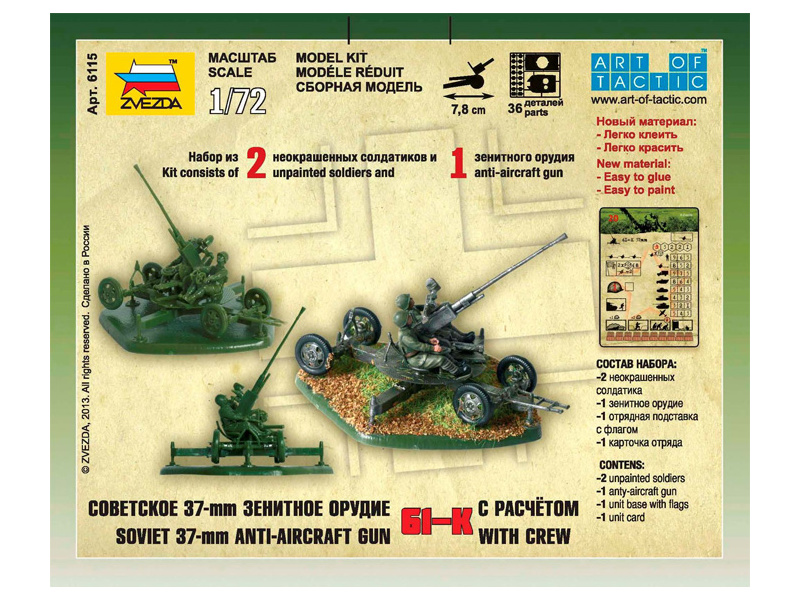 Plastikový model Zvezda 6115 – sovětské 37 mm dělo 61-K s posádkou v měřítku 1:72. Stavebnice obsahuje 36 dílků, délka 78 mm, obtížnost 2. Ideální pro doplnění plastikových modelů či diorámat.