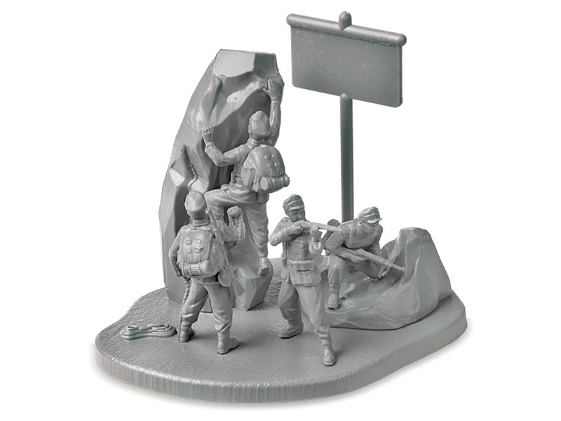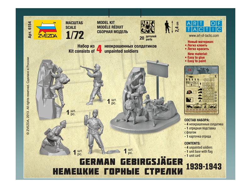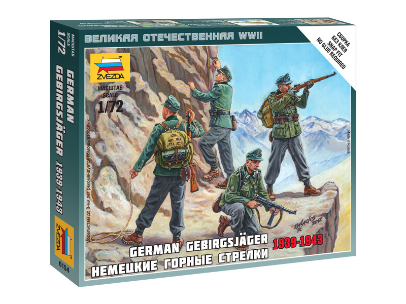 Plastikový model Zvezda 6154 - figurky německých horských střelců 1939-1943 v měřítku 1:72. Stavebnice obsahuje 20 dílků, výška figurky 24 mm, obtížnost 2. Ideální pro doplnění plastikových modelů či diorámat.