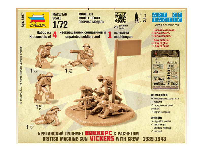 Sada doplňující plastikové modely Zvezda 6167 - britský kulomet s vojáky 1939-1943 v měřítku 1:72. Stavebnice obsahuje 28 dílků, výška figurky 24 mm, obtížnost 3.