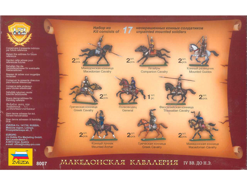 Sada doplňující plastikové modely Zvezda 8007 - figurky makedonské kavalerie IV-II B. C. v měřítku 1:72. Stavebnice obsahuje 17 dílků, výška figurky 35 mm.