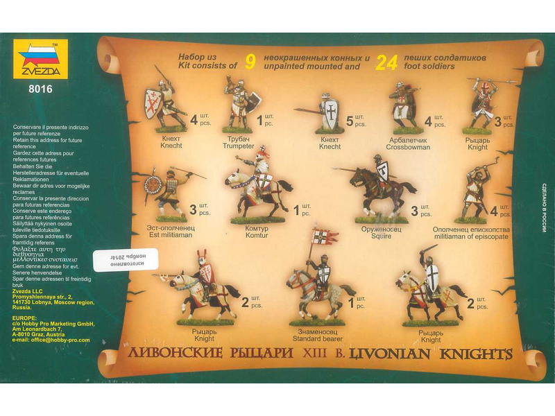 Sada doplňující plastikové modely Zvezda 8016 - figurky rytířů Livonského řádu XII. - XIV. století v měřítku 1:72. Stavebnice obsahuje 33 dílků, výška figurky 24 mm.