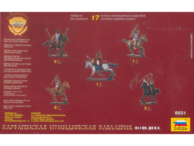 Sada doplňující plastikové modely Zvezda 8031 - figurky karthagenské kavalérie Numidian v měřítku 1:72. Stavebnice obsahuje 17 dílků.