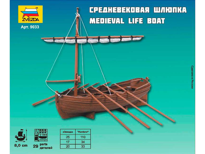 Plastikový model Zvezda 9033 - středověký malý člun v měřítku 1:72 ke slepení. Stavebnice obsahuje 23 dílků, délka 90 mm, obtížnost 4.