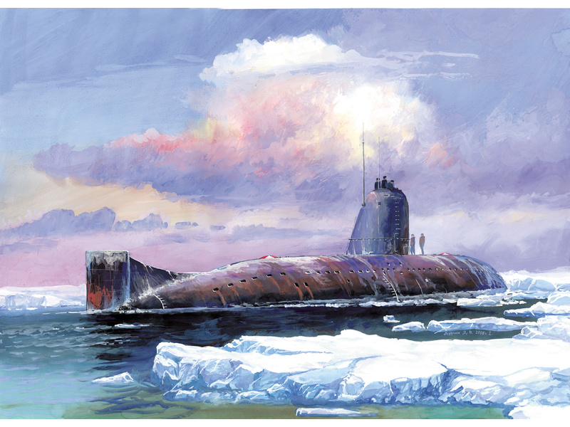 Plastikový model Zvezda 9035 - ruská jaderná ponorka K-3 Leninskij Komsomol. Měřítko 1:350, délka 30,5 cm. Stavebnice obsahuje 34 dílků ke slepení.