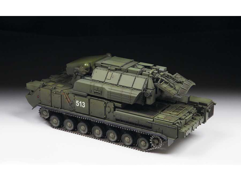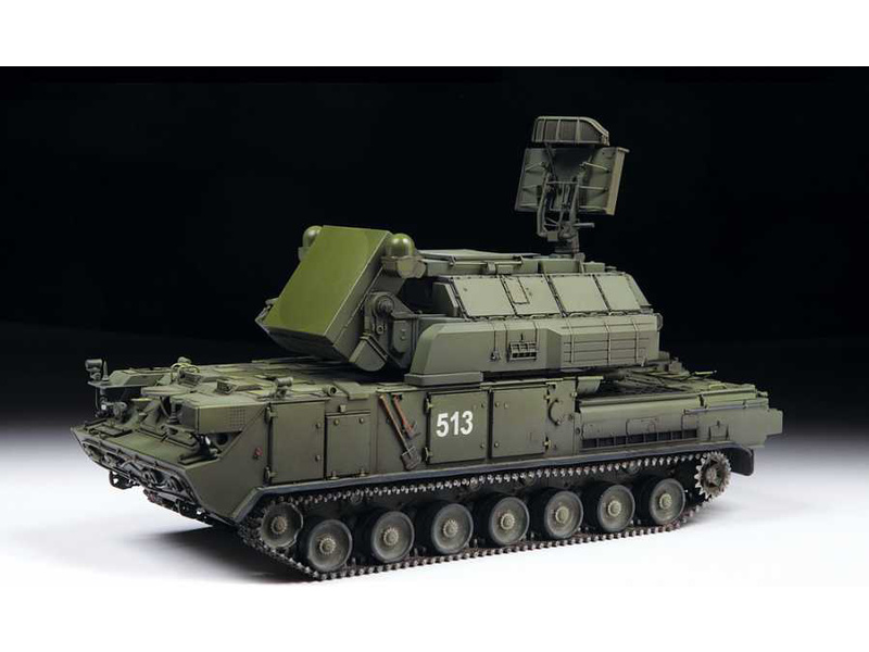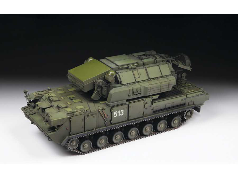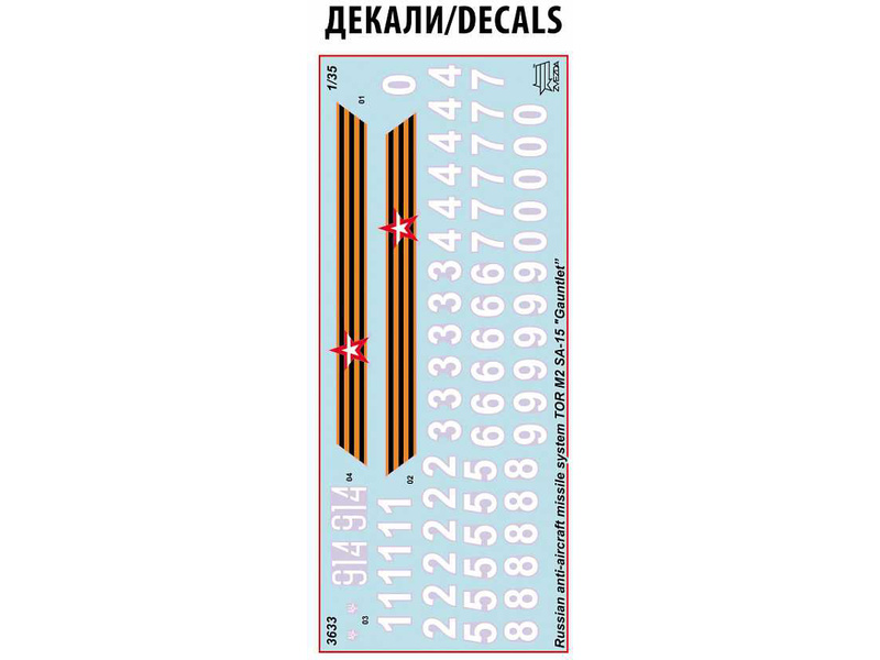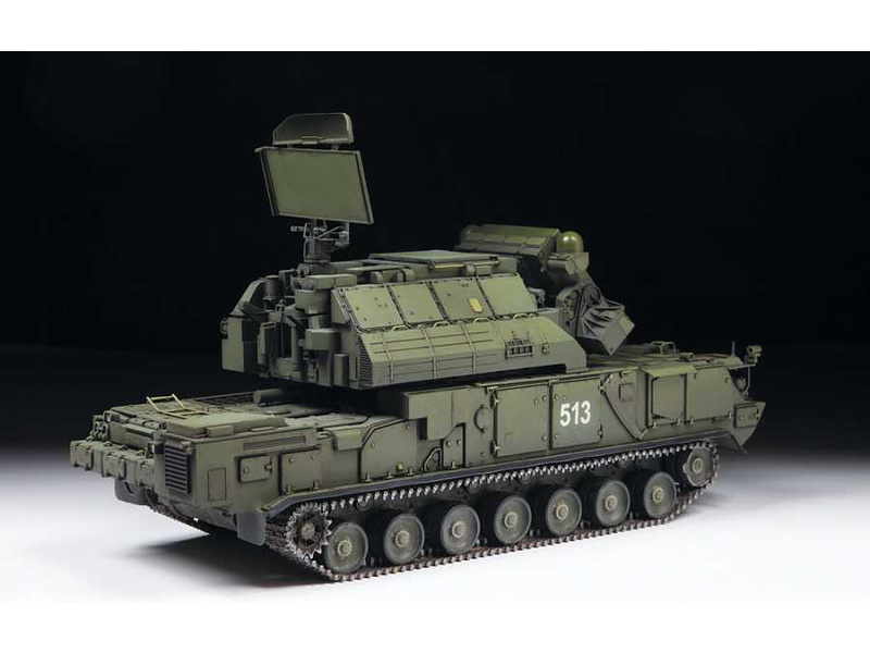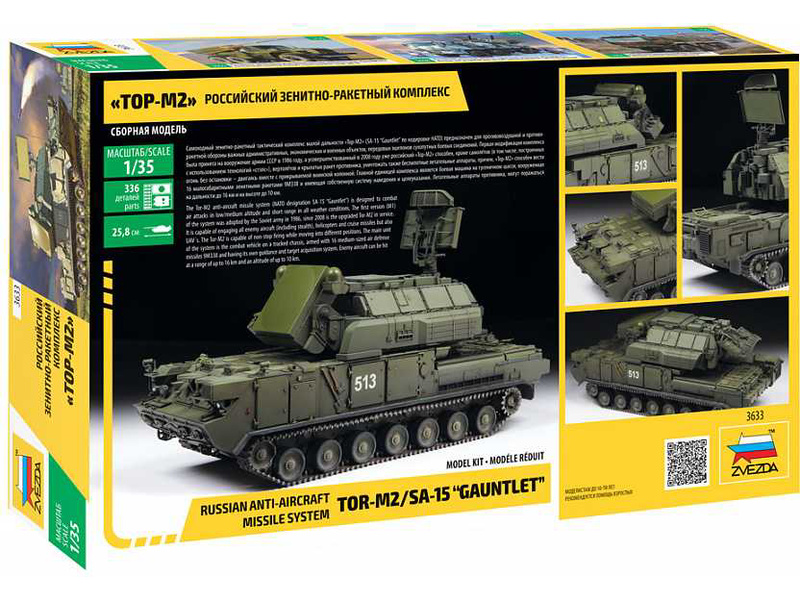Plastikový model Zvezda 3633 - ruský protiletadlový raketový systém "TOR-M2" v měřítku 1:35 ke slepení. Stavebnice obsahuje 336 dílků, délka 258 mm.