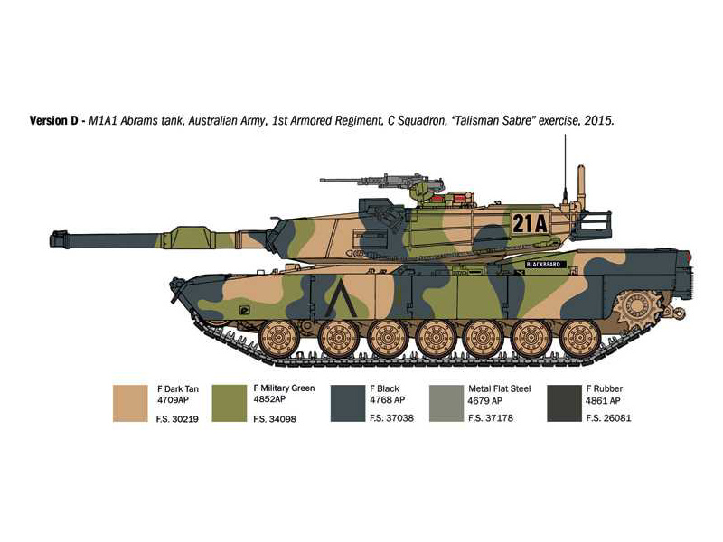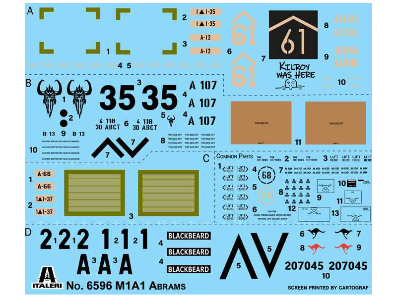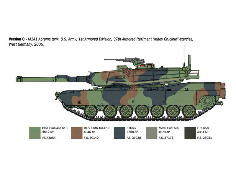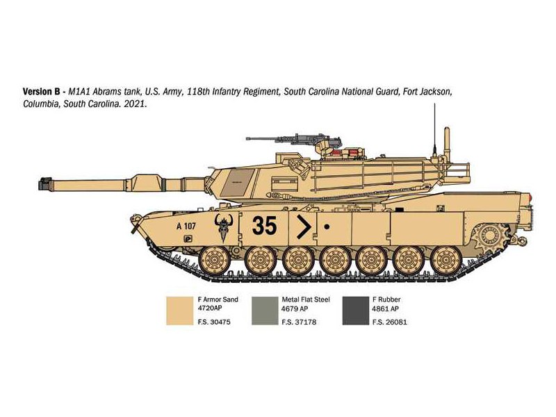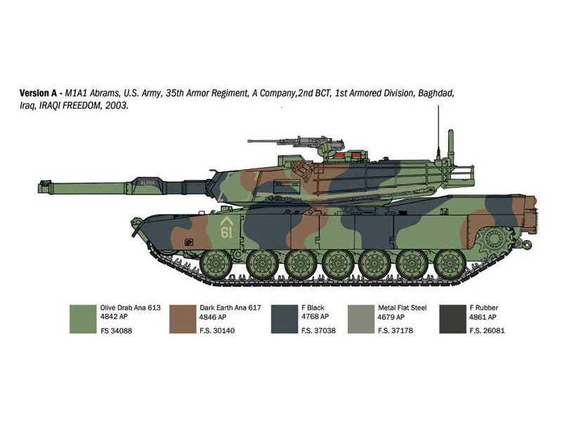 Italeri plastikový model tanku M1A1/A2 Abrams v měřítku 1:35 ke slepení. Délka modelu 279 mm, obtížnost 4. Balení obsahuje skvělé obtisky pro 4 verze.