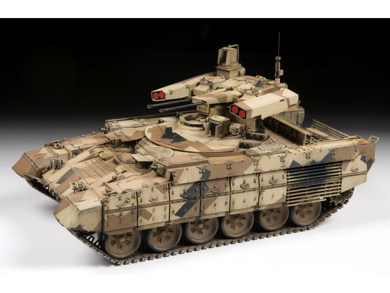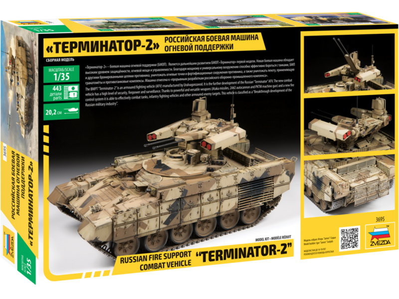 Plastikový model Zvezda 3695 - bojové vozidlo pro palebnou podporu tanků „TERMINATOR-2“ v měřítku 1:35 ke slepení. Stavebnice obsahuje 443 dílků, délka 200 mm, obtížnost 5.