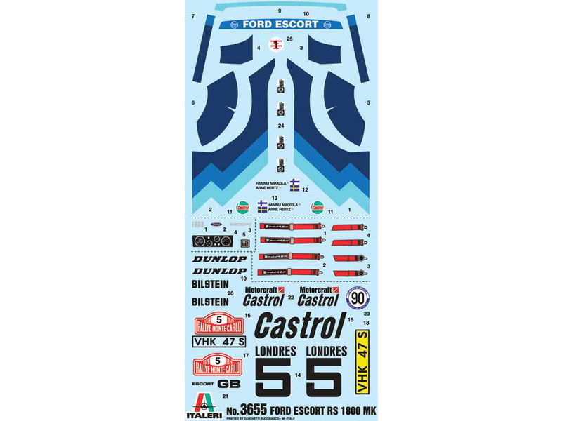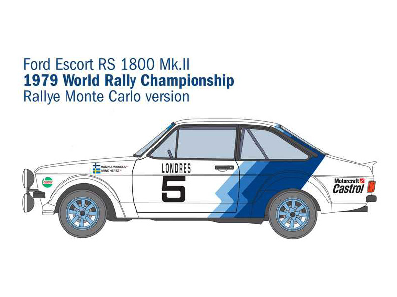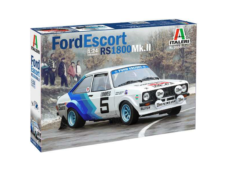 Plastikový model Italeri 3655 – auto Ford Escort RS1800 Mk. II v měřítku 1:24 ke slepení. Délka modelu 167 mm, obtížnost 2. Balení obsahuje SUPER OBTISKY.