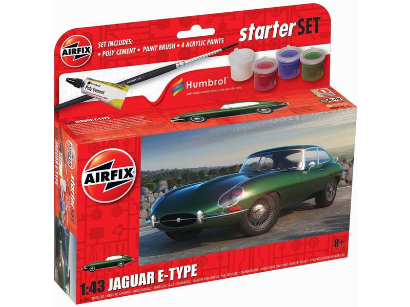 Plastikový model Airfix A55009 - auto Jaguar E-Type v měřítku 1:43 ke slepení. Stavebnice obsahuje 23 dílků, lepidlo, štětec, barvičky, délka 104 mm, obtížnost 1.