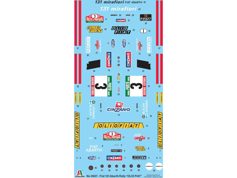 Plastikový model Italeri 3667 - auto Fiat 131 Abarth Rally Olio Fiat v měřítku 1:24 ke slepení. Délka modelu 174 mm, obtížnost 3. Balení obsahuje SKVĚLÉ OBTISKY.