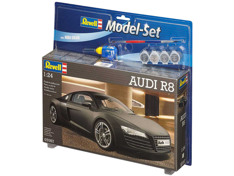 Plastikový model Revell 67057 – auto Audi R8 v měřítku 1:24 ke slepení. Stavebnice obsahuje 106 dílků, lepidlo, štětec a barvičky, délka 184 mm, obtížnost 3.
