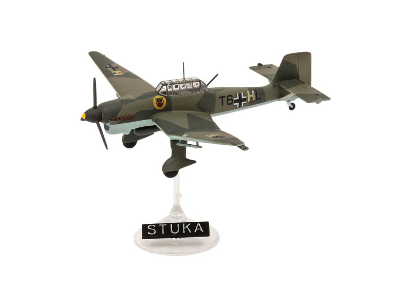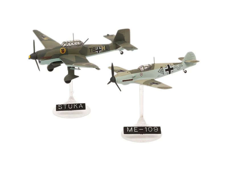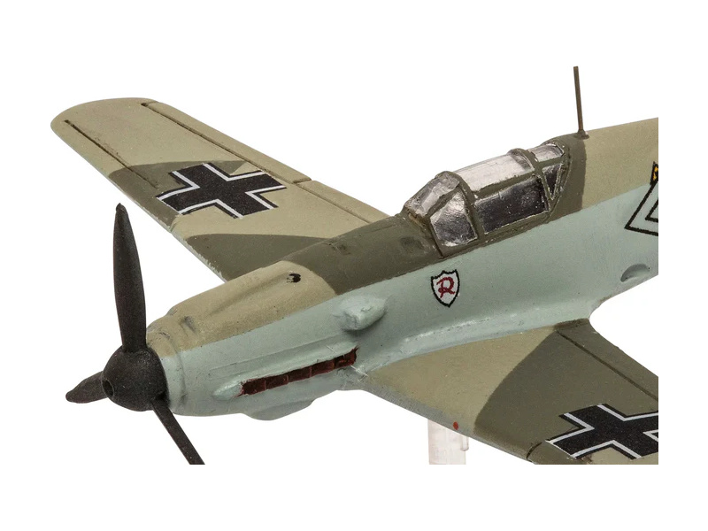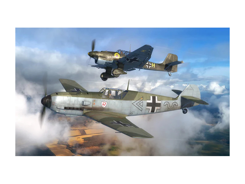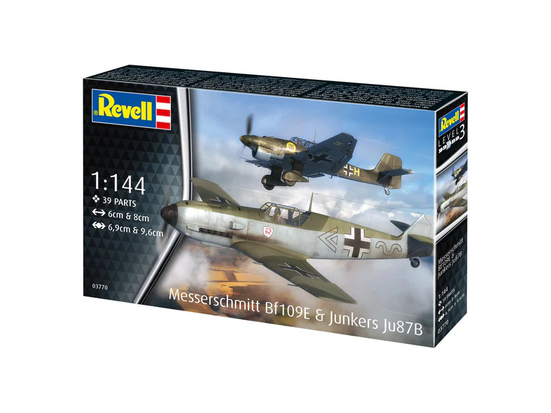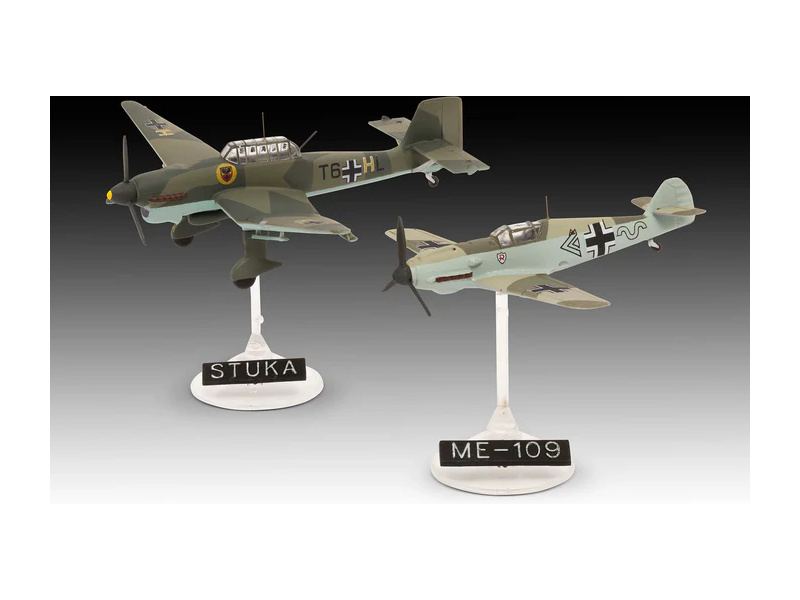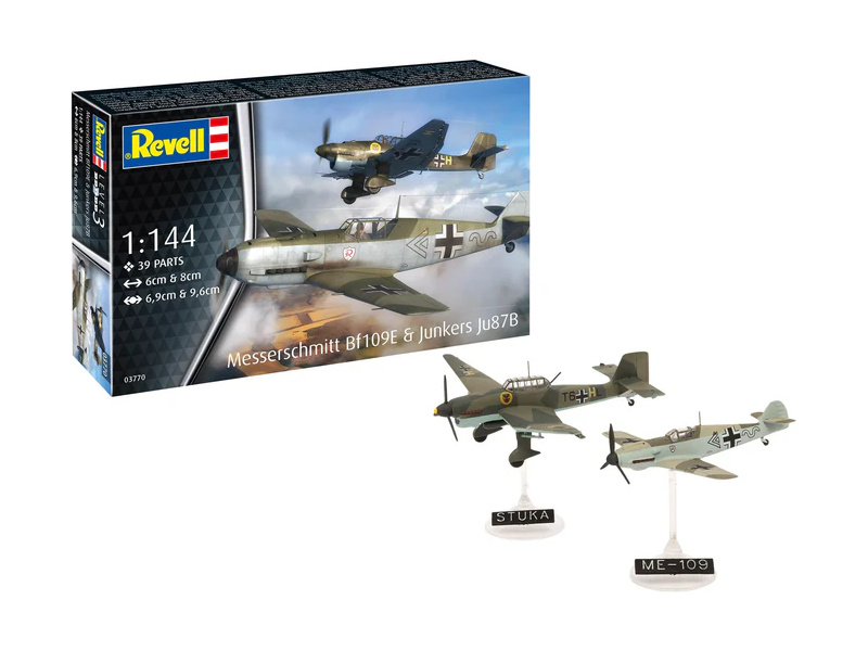 Plastikový model Revell 73770 – letadla Messerschmitt Bf109E & Ju87B Stuka v měřítku 1:144 ke slepení. Stavebnice obsahuje 39 dílků, délka 6/8 cm, obtížnost 3.