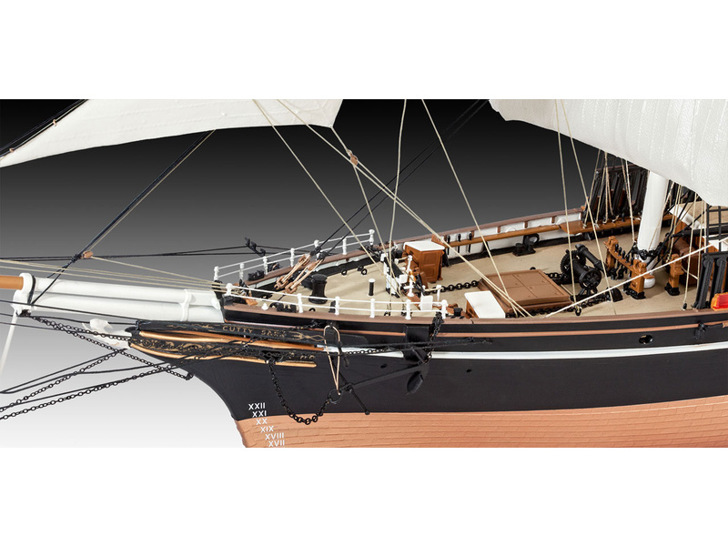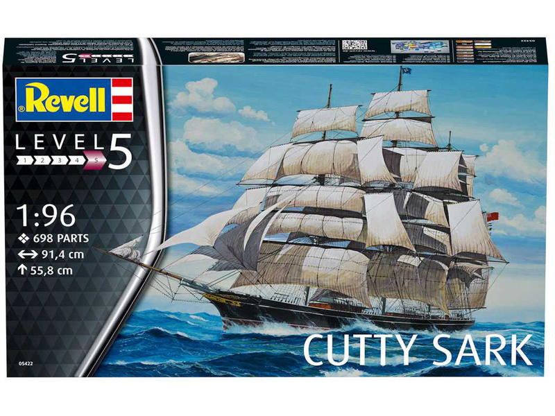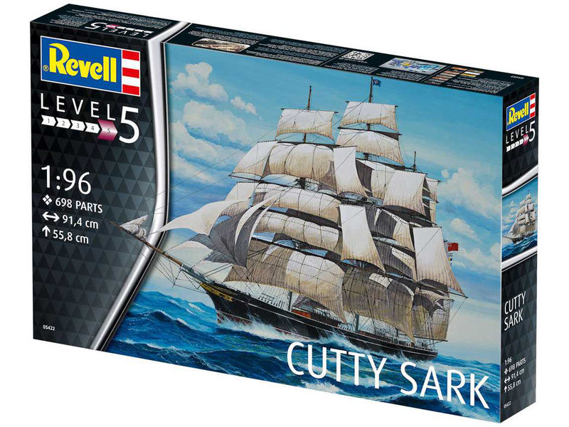 Plastikový model lodě Revell 05422 - Cutty Sark v měřítku 1:96 ke slepení. Stavebnice obsahuje 698 dílků, délka 914 mm, obtížnost 5.