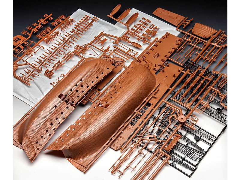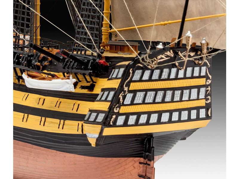 Plastikový model Revell 65408 – vlajková loď H.M.S. Victory v měřítku 1:225 ke slepení. Stavebnice obsahuje 269 dílků, délka 400 mm, obtížnost 4.