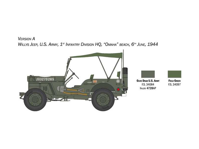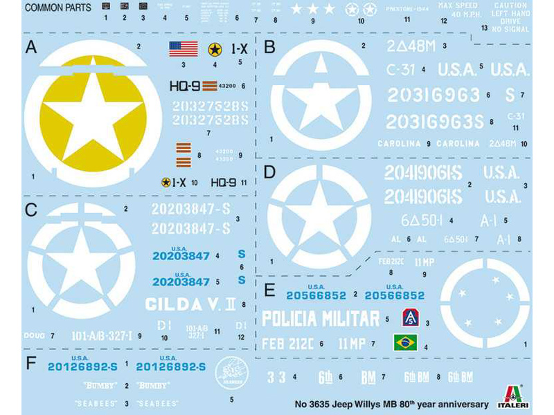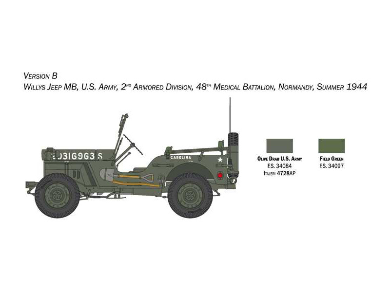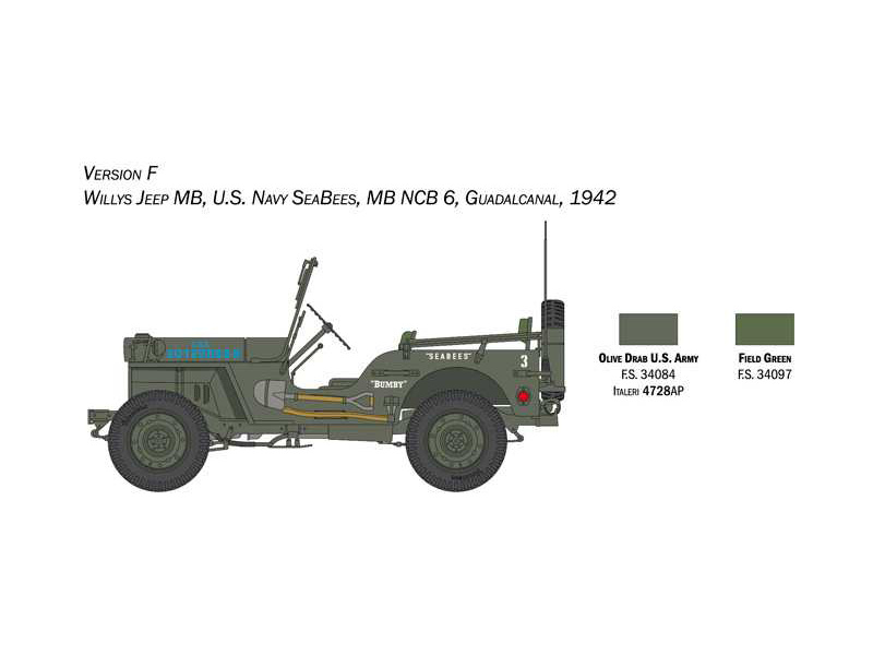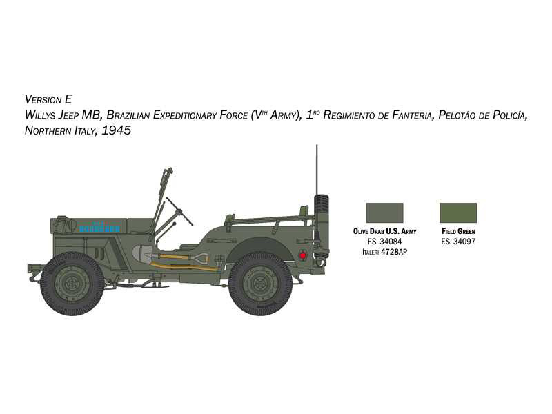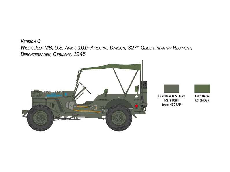 Plastikový model Italeri 3635 - military Willys Jeep MB v měřítku 1:24 ke slepení. Délka modelu 138 mm, obtížnost 2. Balení obsahuje SKVĚLÉ OBTISKY PRO 6 VERZÍ.